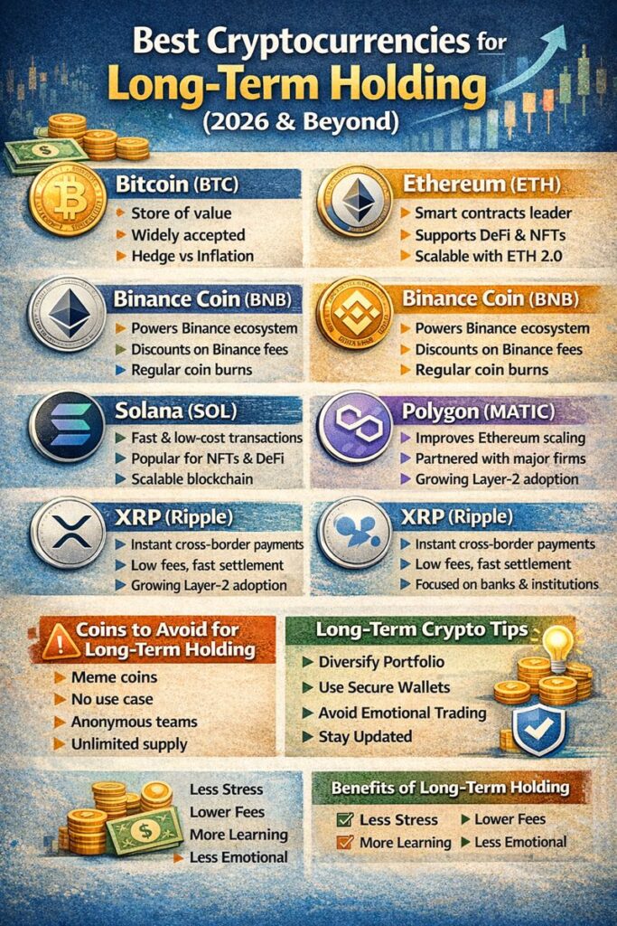 Long-term crypto investing rewards patience, research, and discipline. Coins like Bitcoin, Ethereum, BNB, Cardano, and Solana offer strong foundations and real-world use cases that make them suitable for long-term holding.